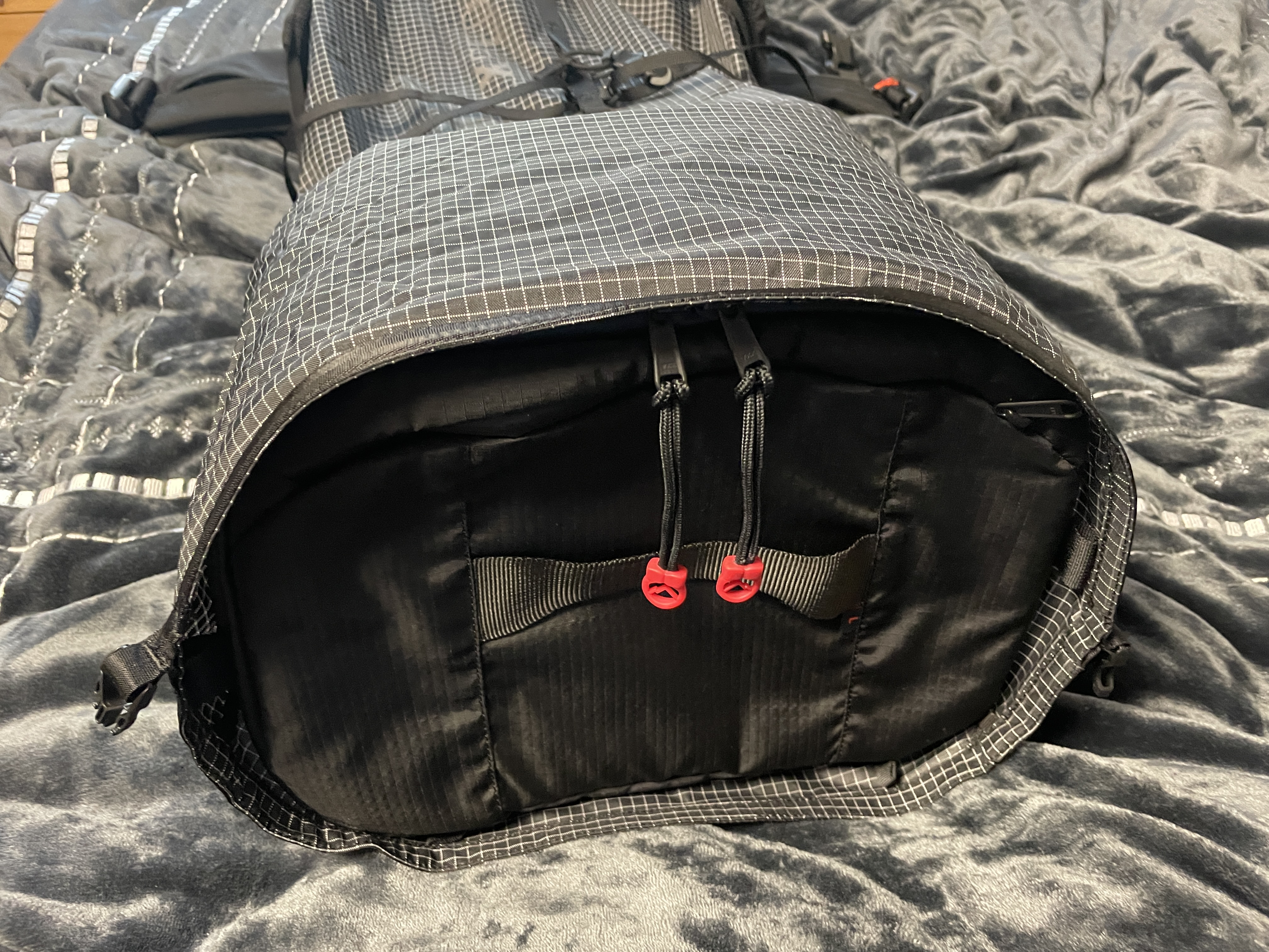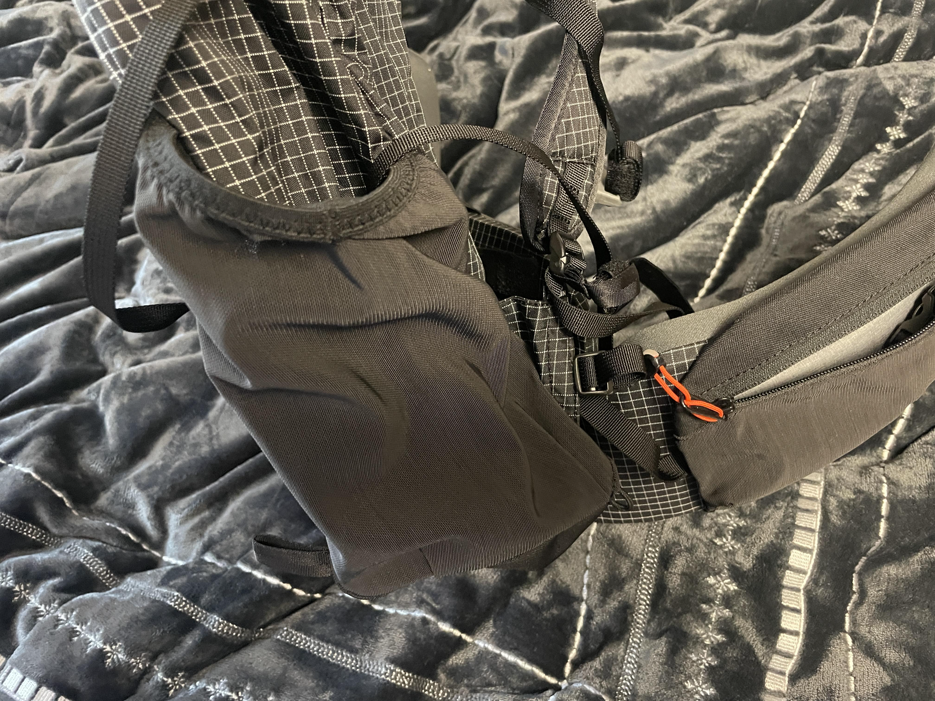 사용할 적은 없지만, 물주머니 호수를 빼는 부분입니다. 요즘 웬만한 배낭에는 다 있지만, 없는 배낭도 있다는 점. 고로 있으면 다음에 한번 사용할 수도 있으니 있으면 좋다는 결론. 무튼 이전에 카즈카를 사용하다가 라이트닝 배낭을 사용하고 느끼는 점은 일단 경량 배낭이라서 그런지 주머니가 적고 메인 짐을 넣을 때 카즈카의 경우 양측 사이드에 지퍼가 달려있어서 배낭을 눕혀서 짐을 넣고 뺄 수 있어서 편했는데 BPL 배낭들의 경우 대다수 위에서 넣고 빼는 방식이어서 맨 아래쪽의 짐을 뺴야하는 경우가 생기면 위쪽의 짐을 모두 빼야 한다는 점이 좀 불편하더라고요. 한번 겪고 나면 이후에 테트리스 순서를 잘 정리해서 하게 되었습니다 :) (스스로를 정리 왕으로 만들어주는 배낭..ㅋ)