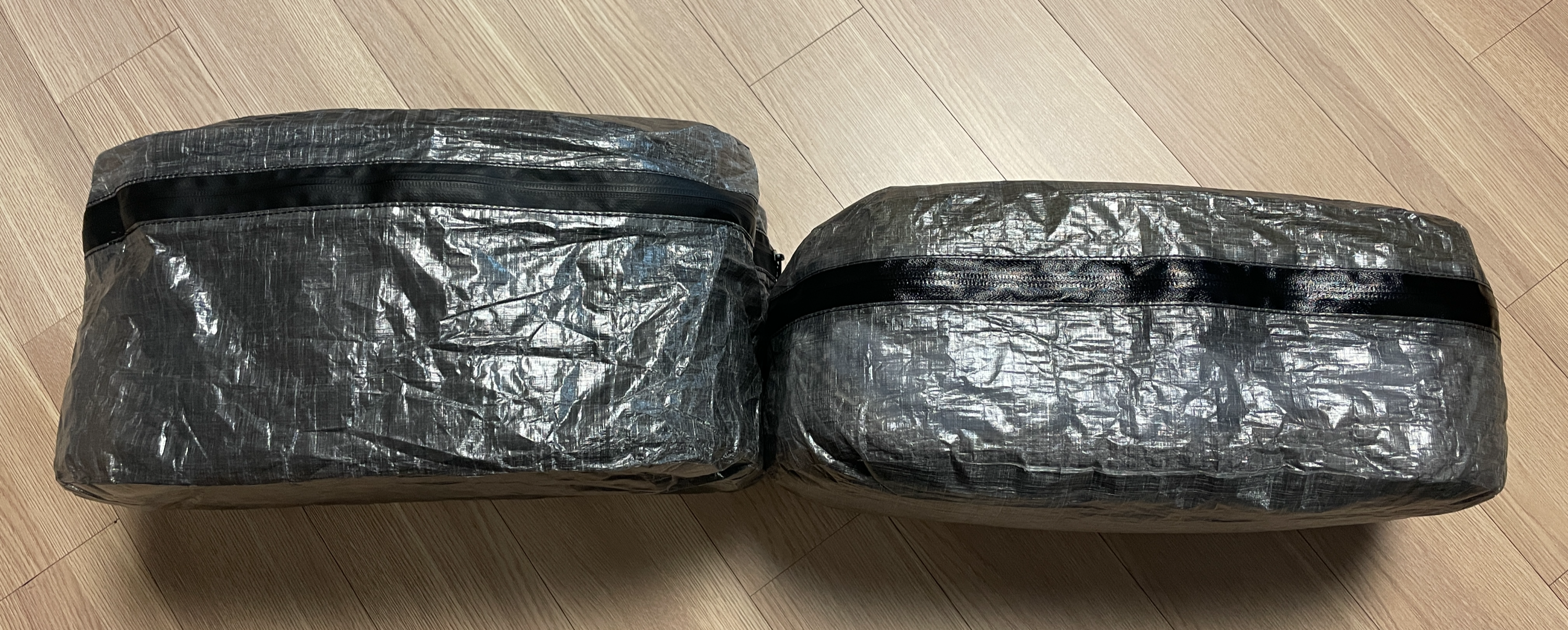 기존에 사용하던 미스테리월 사의 '에코 D팩 LS, D팩 3.0 L' 제품과 비교한 사진입니다. 넓이가 조금 더 넓고 높이가 조금 낮아요. 물건을 담다 보면 패커블타입이라서 한없이 들어갑니다. 힐레베르그 솔로BL 텐트도 수납해 보았는데 잘 맞네요~ㅎㅎ