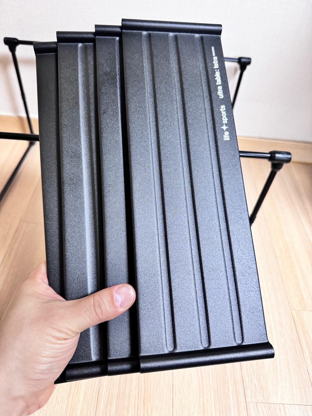 life sports 파티오 테이블 라이프 스포츠 테이블 '파티오' 제품입니다. 성인손이 닿았을 때 크기는 요정도 느낌이에요~ 어깨끈이 달려있어서 물건을 들고 이동할 때 편합니다. 테이블 다리, 상판